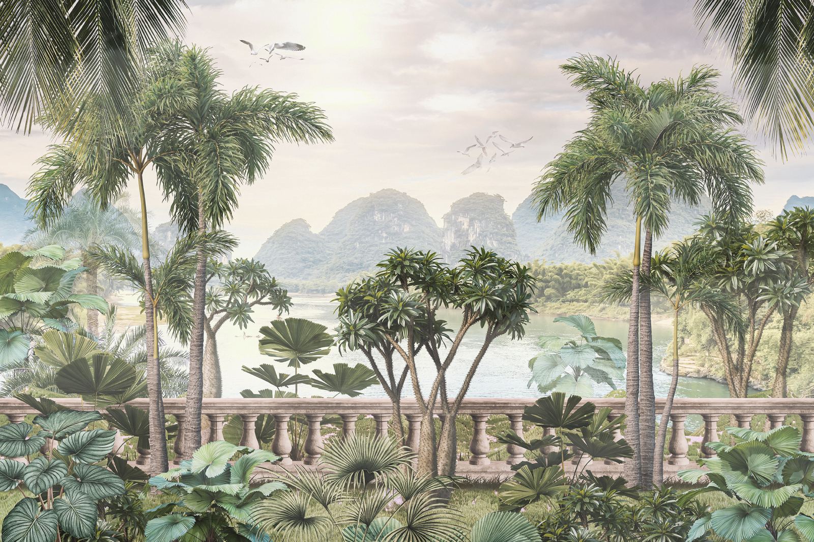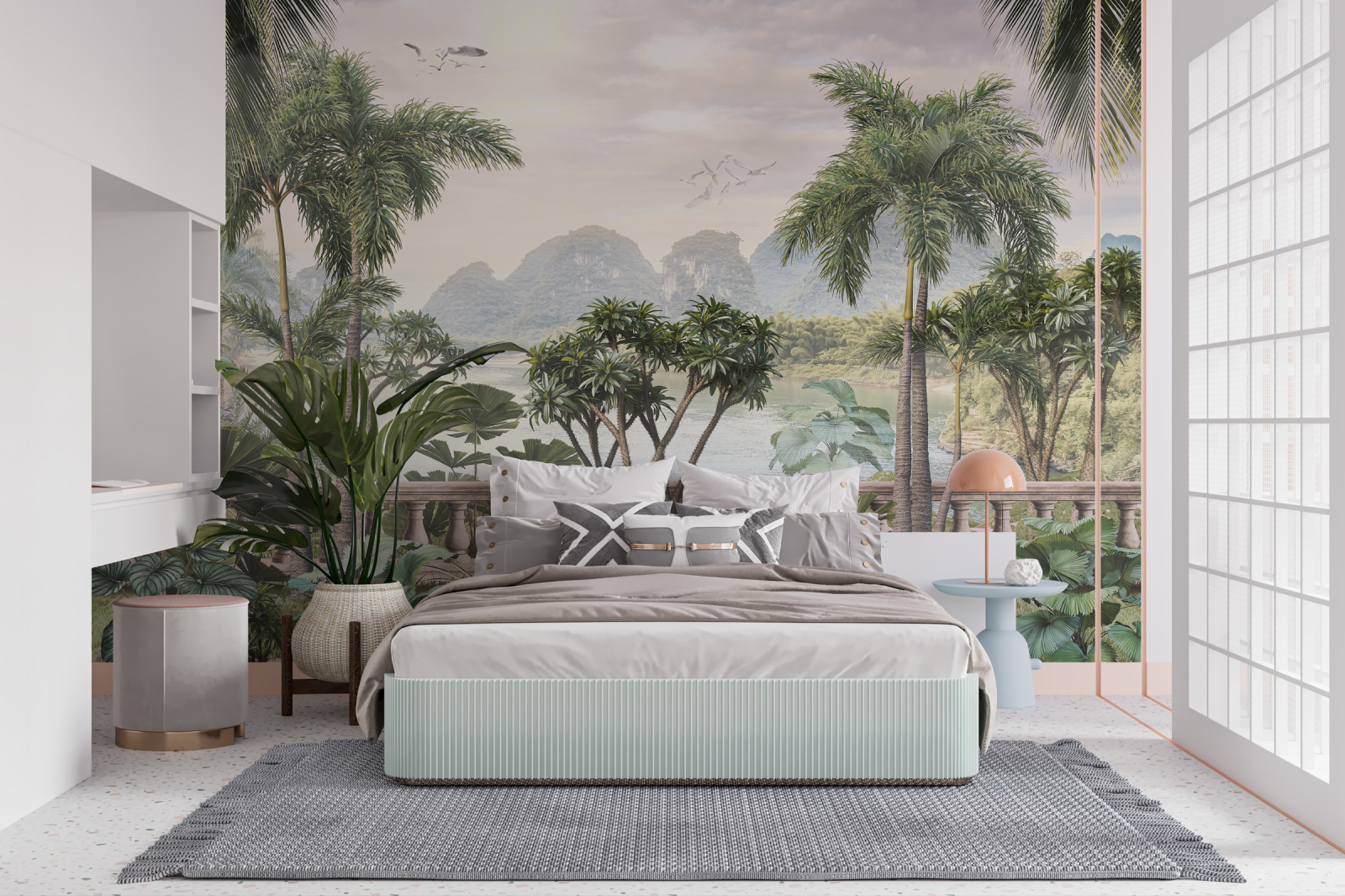 Vegetația tropicală îmbrățișează camera în nuanțe plăcute de verde, gri și galben. Plantele uriașe creează un ecosistem suprarealist în care natura devine dominantă, oferind viață și energie întregului spațiu.