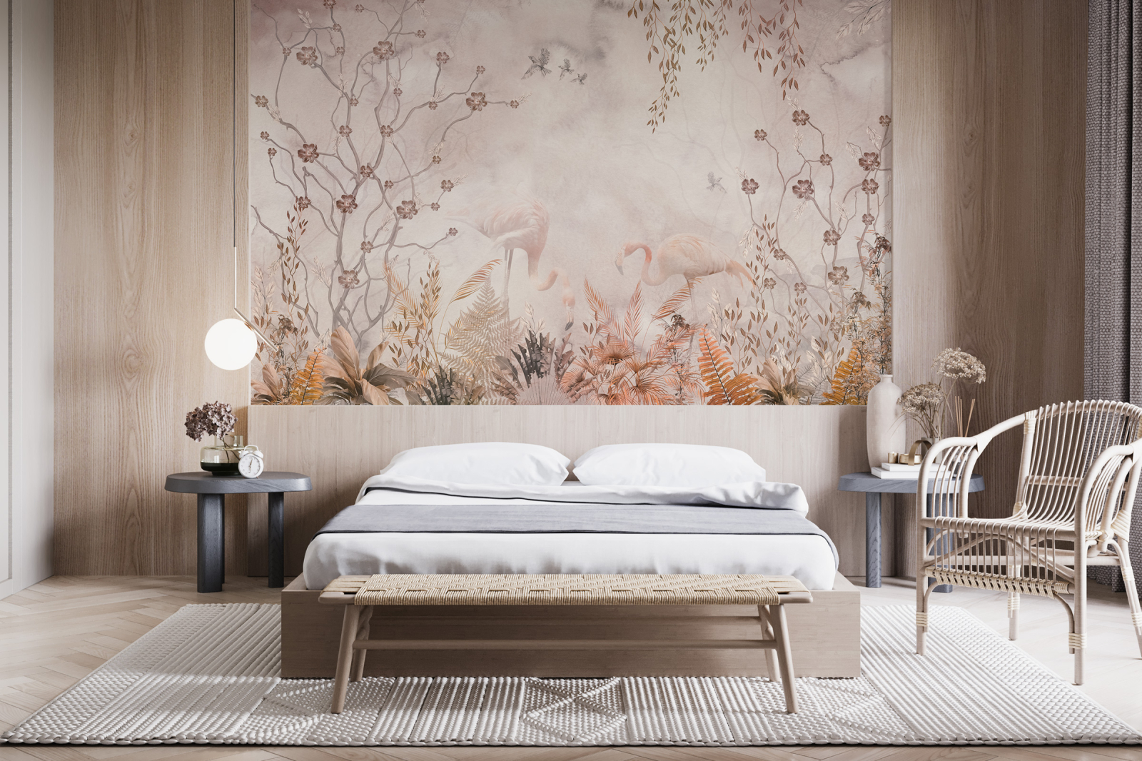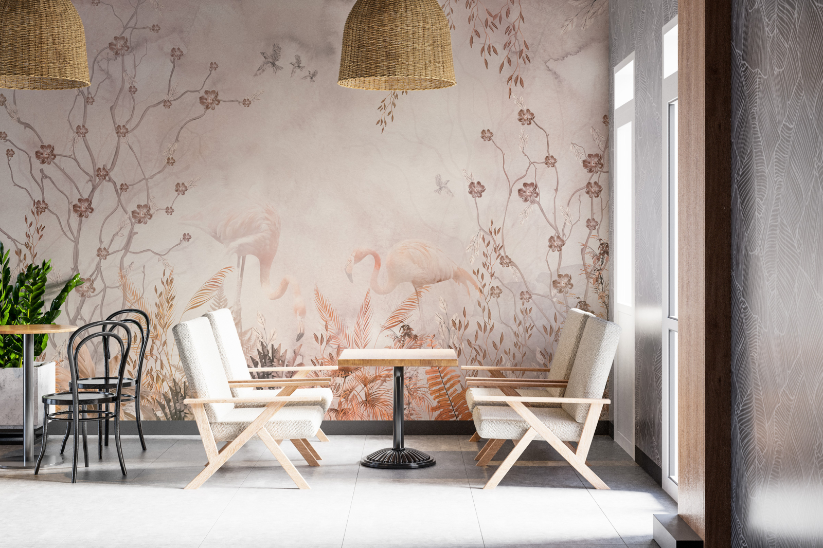 Vegetația tropicală îmbrățișează camera în nuanțe plăcute de verde, gri și galben. Plantele uriașe creează un ecosistem suprarealist în care natura devine dominantă, oferind viață și energie întregului spațiu.