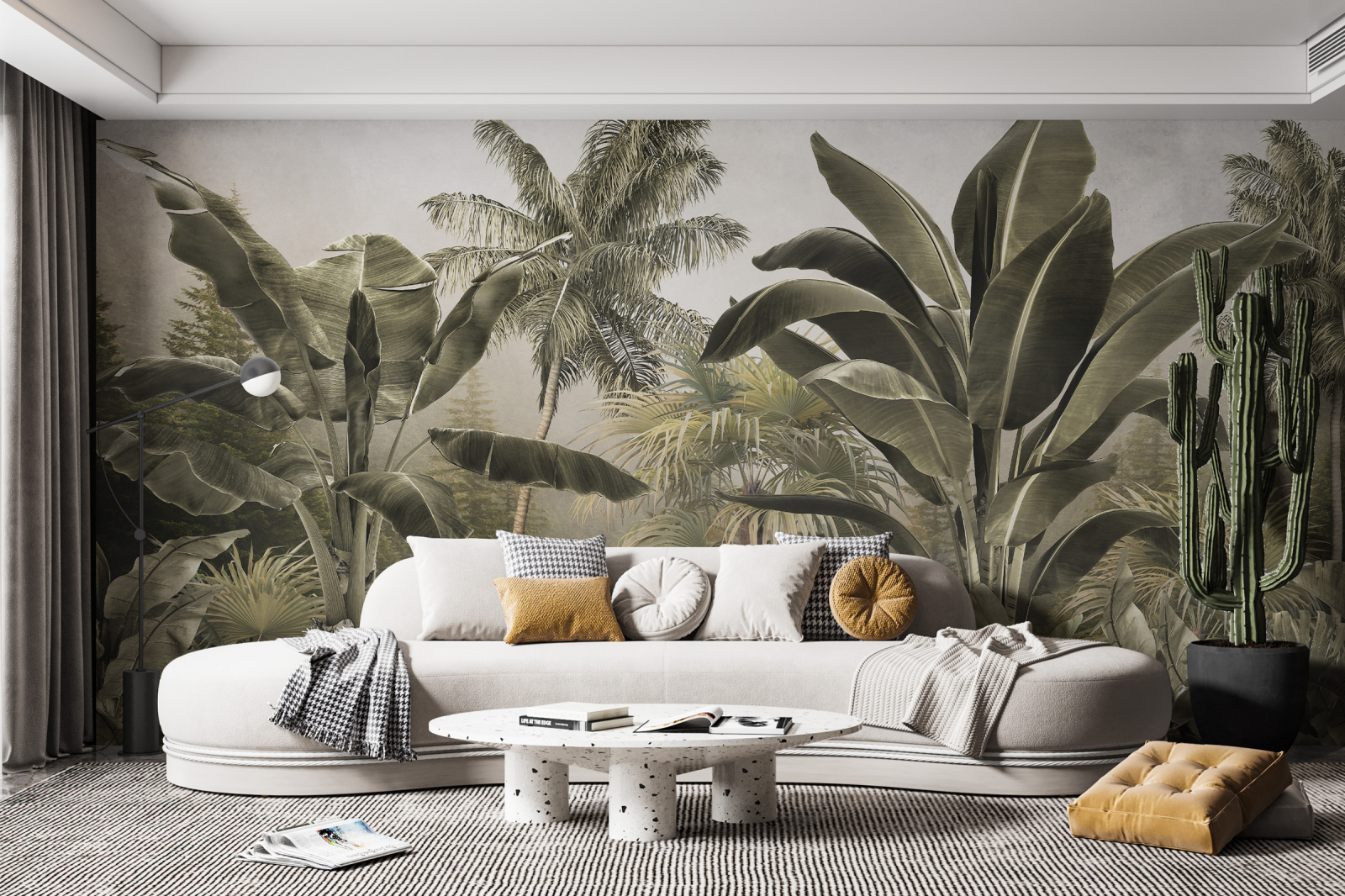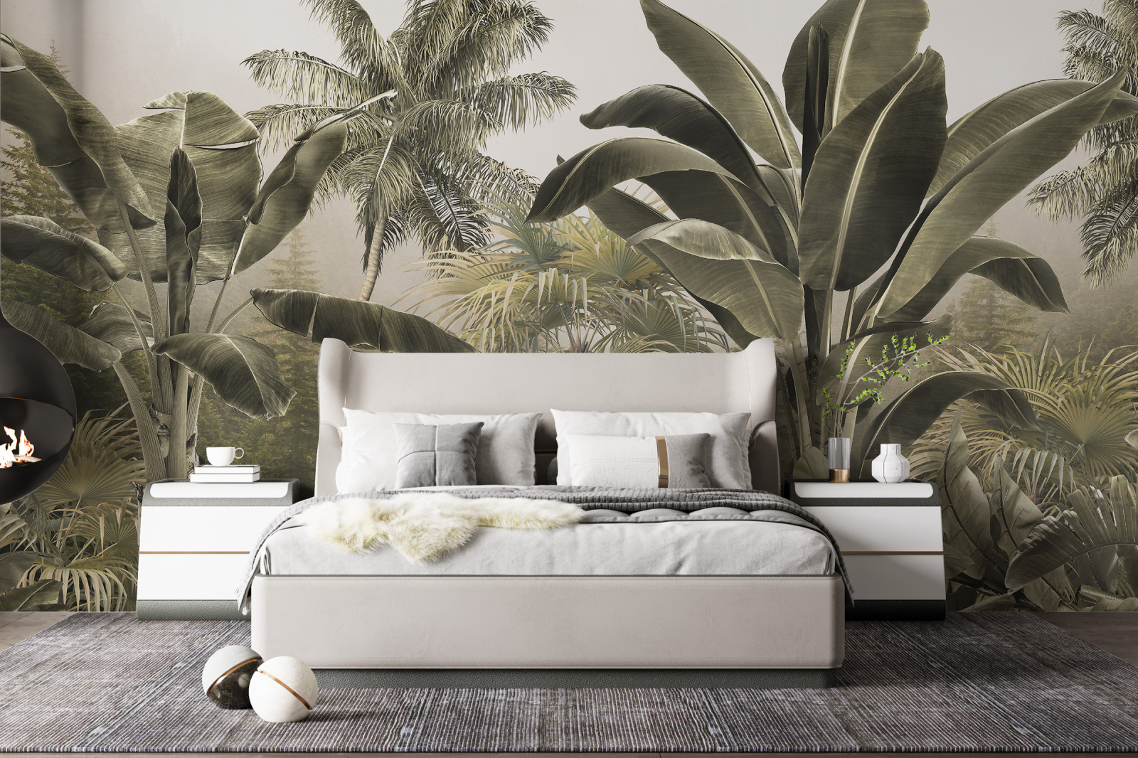 Vegetația tropicală îmbrățișează camera în nuanțe plăcute de verde, gri și galben. Plantele uriașe creează un ecosistem suprarealist în care natura devine dominantă, oferind viață și energie întregului spațiu.