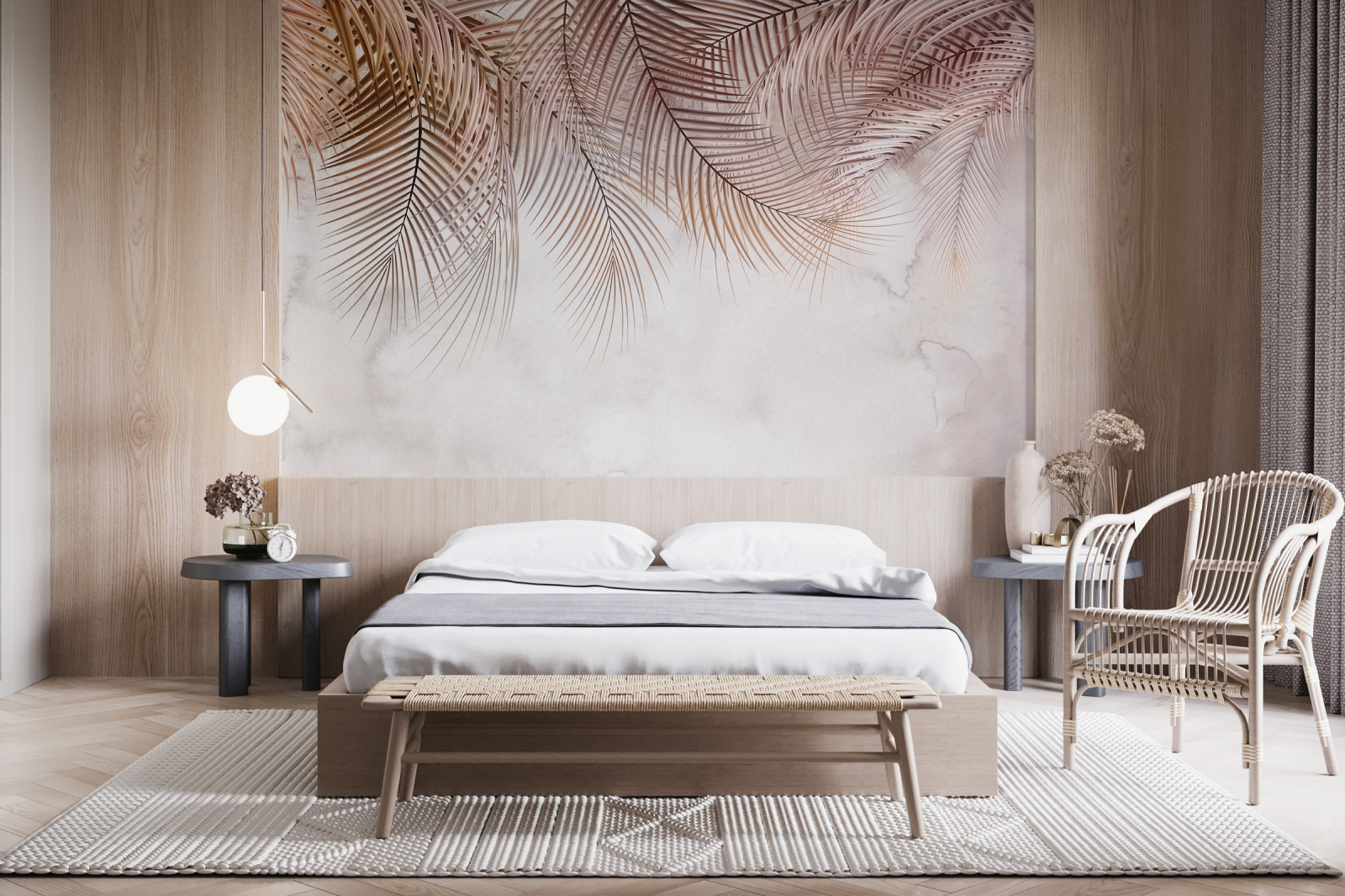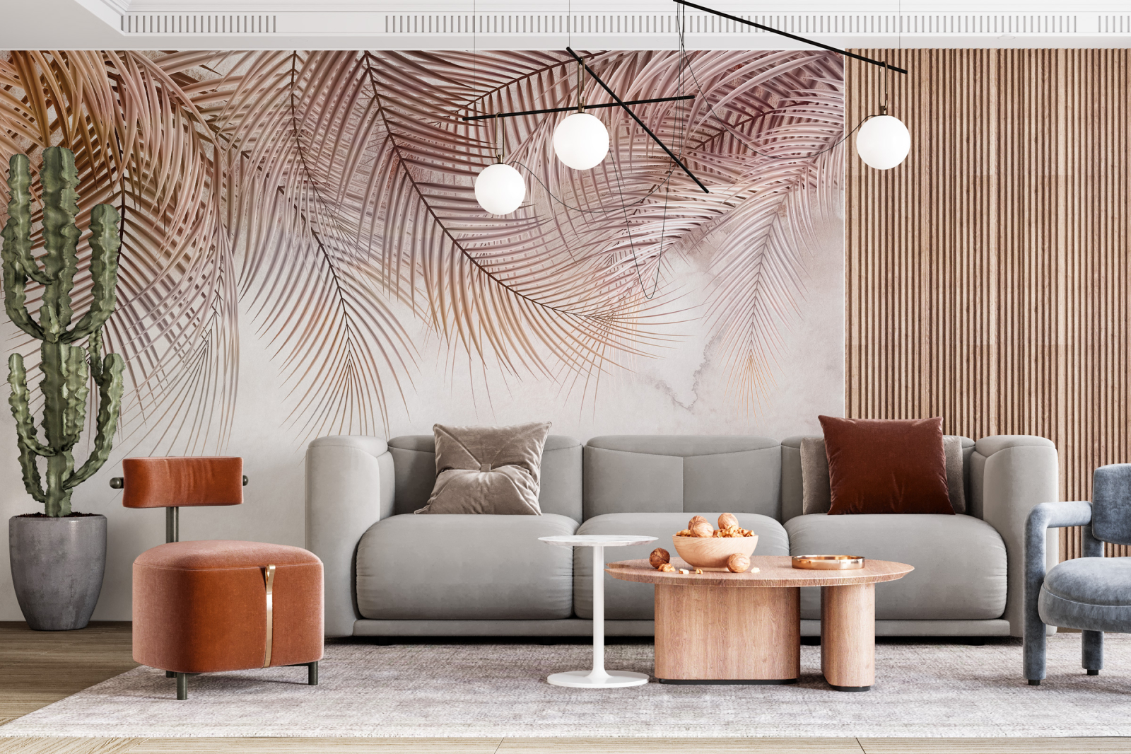 Vegetația tropicală îmbrățișează camera în nuanțe plăcute de verde, gri și galben. Plantele uriașe creează un ecosistem suprarealist în care natura devine dominantă, oferind viață și energie întregului spațiu.