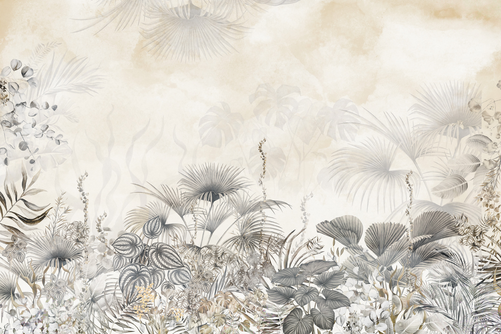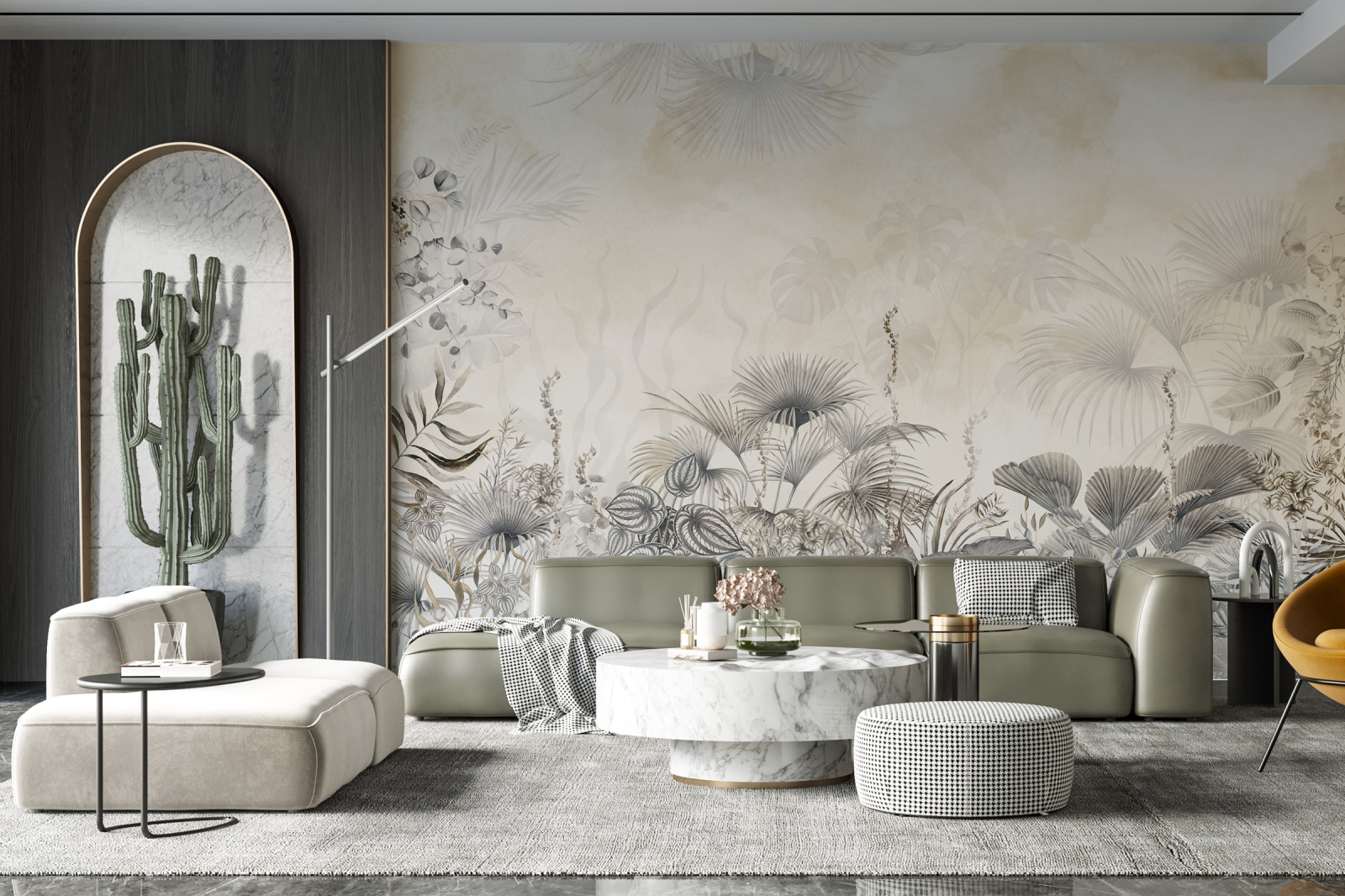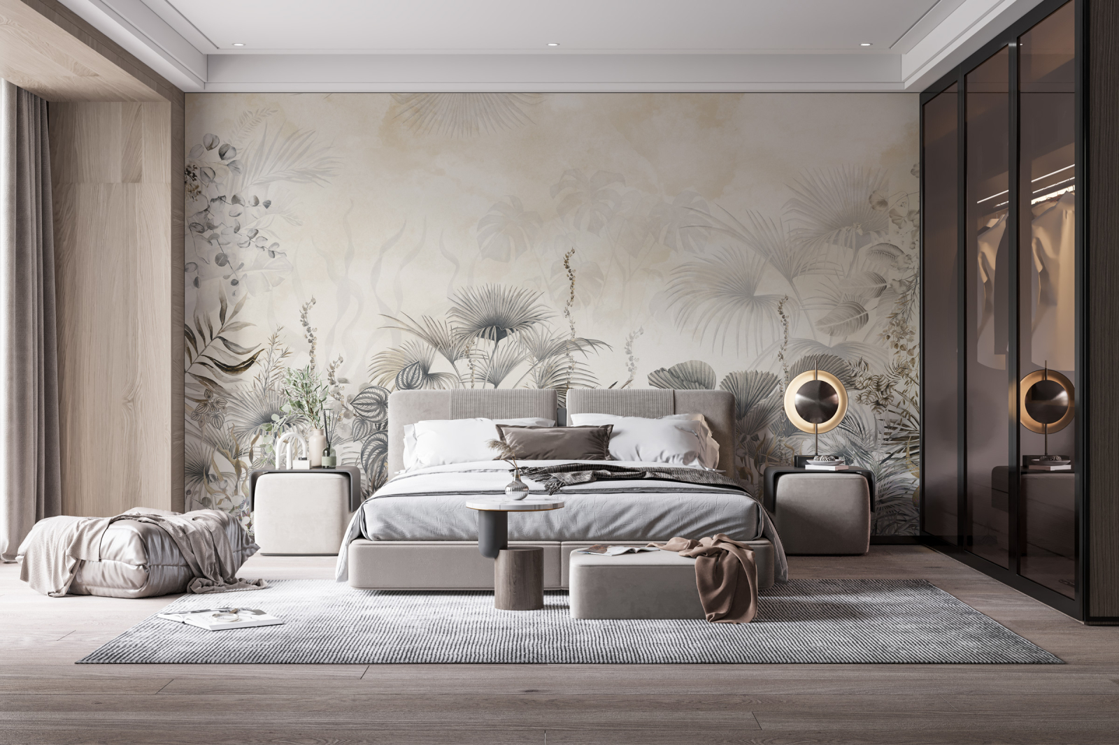 Vegetația tropicală îmbrățișează camera în nuanțe plăcute de verde, gri și galben. Plantele uriașe creează un ecosistem suprarealist în care natura devine dominantă, oferind viață și energie întregului spațiu.