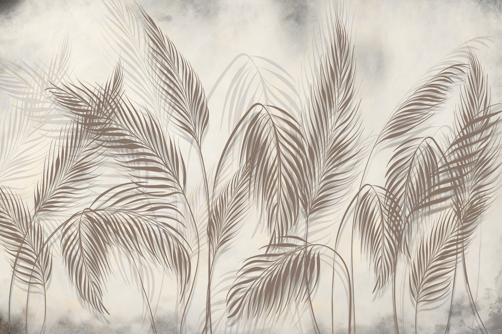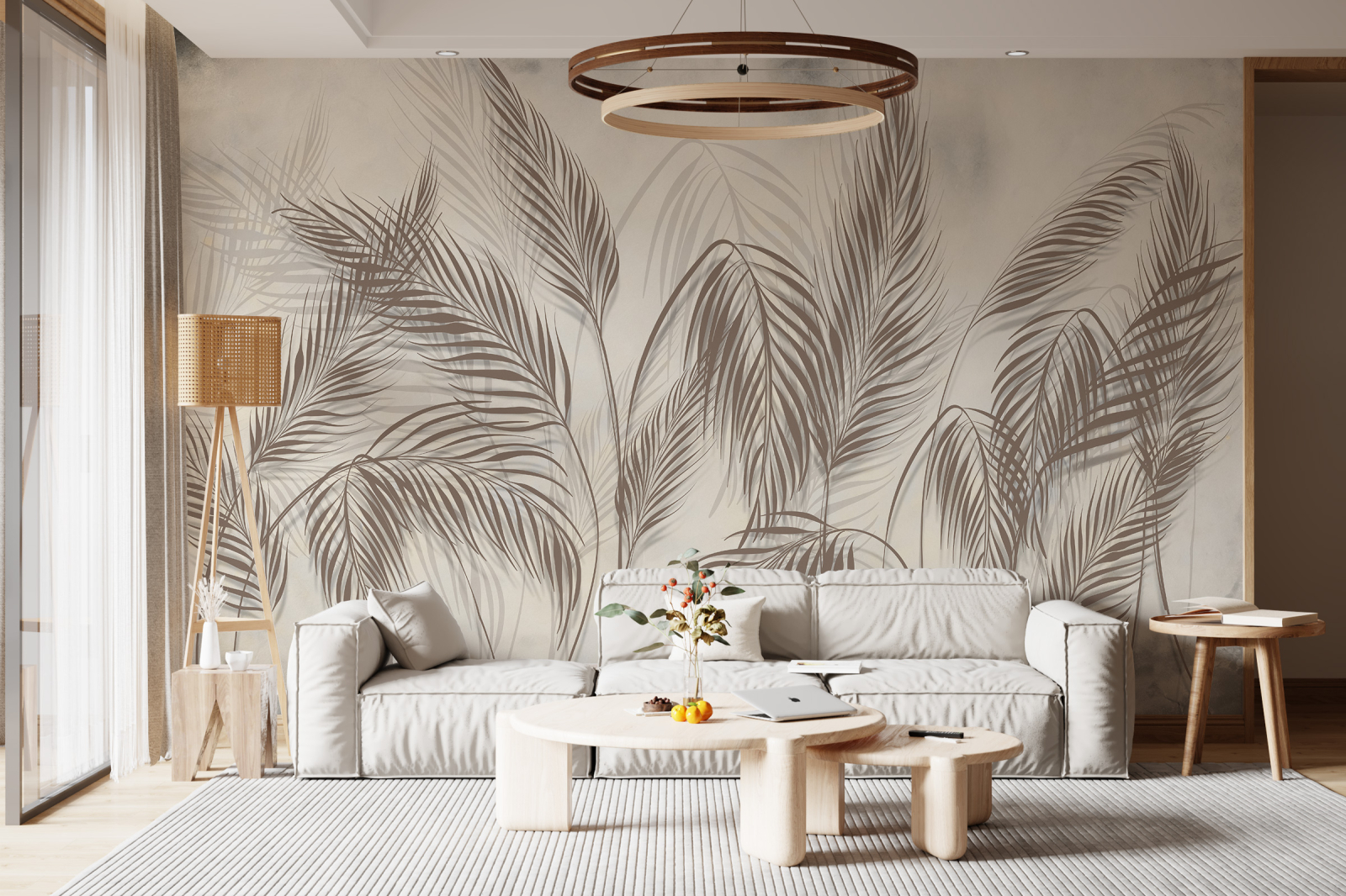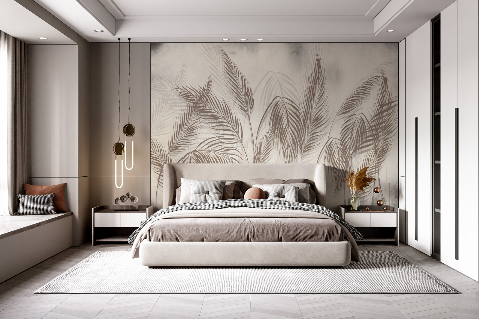 Vegetația tropicală îmbrățișează camera în nuanțe plăcute de verde, gri și galben. Plantele uriașe creează un ecosistem suprarealist în care natura devine dominantă, oferind viață și energie întregului spațiu.