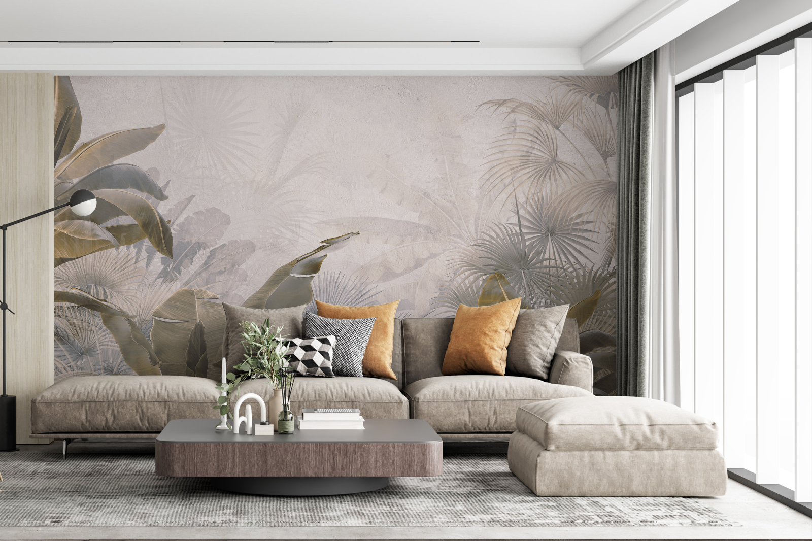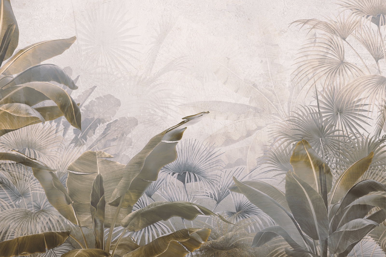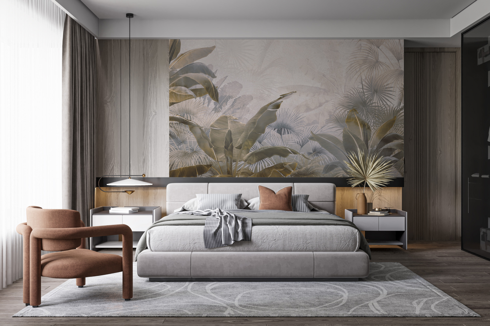 Vegetația tropicală îmbrățișează camera în nuanțe plăcute de verde, gri și galben. Plantele uriașe creează un ecosistem suprarealist în care natura devine dominantă, oferind viață și energie întregului spațiu.