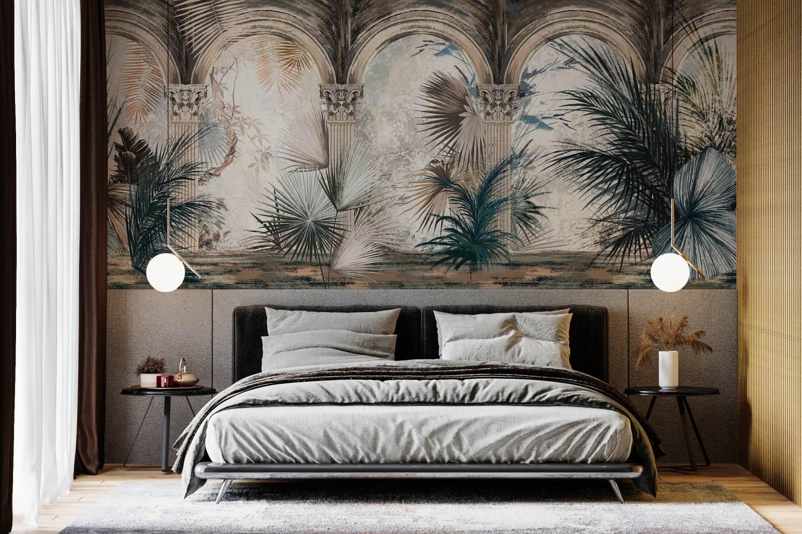 Vegetația tropicală îmbrățișează camera în nuanțe plăcute de verde, gri și galben. Plantele uriașe creează un ecosistem suprarealist în care natura devine dominantă, oferind viață și energie întregului spațiu.