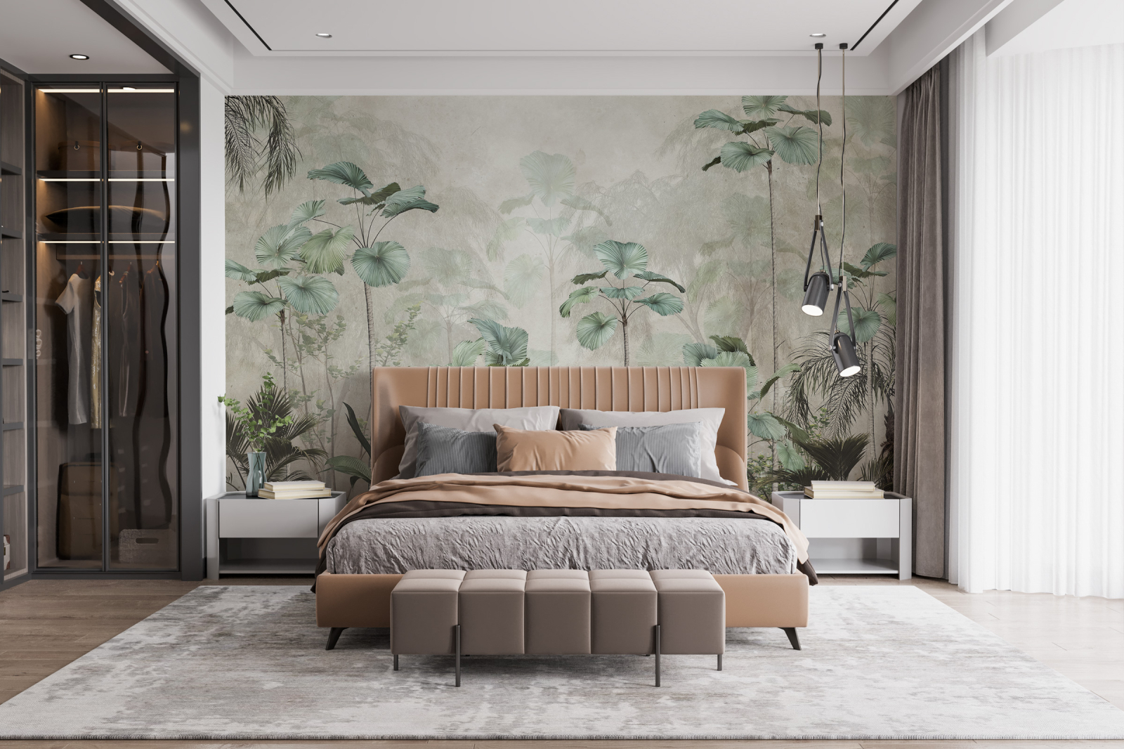 Vegetația tropicală îmbrățișează camera în nuanțe plăcute de verde, gri și galben. Plantele uriașe creează un ecosistem suprarealist în care natura devine dominantă, oferind viață și energie întregului spațiu.