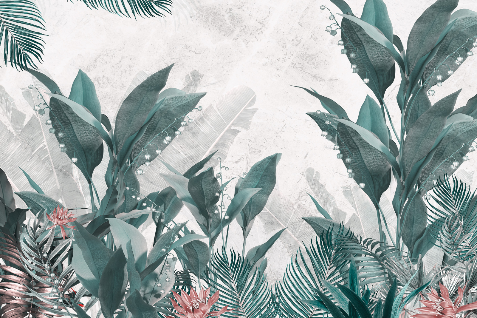 Vegetația tropicală îmbrățișează camera în nuanțe plăcute de verde, gri și galben. Plantele uriașe creează un ecosistem suprarealist în care natura devine dominantă, oferind viață și energie întregului spațiu.