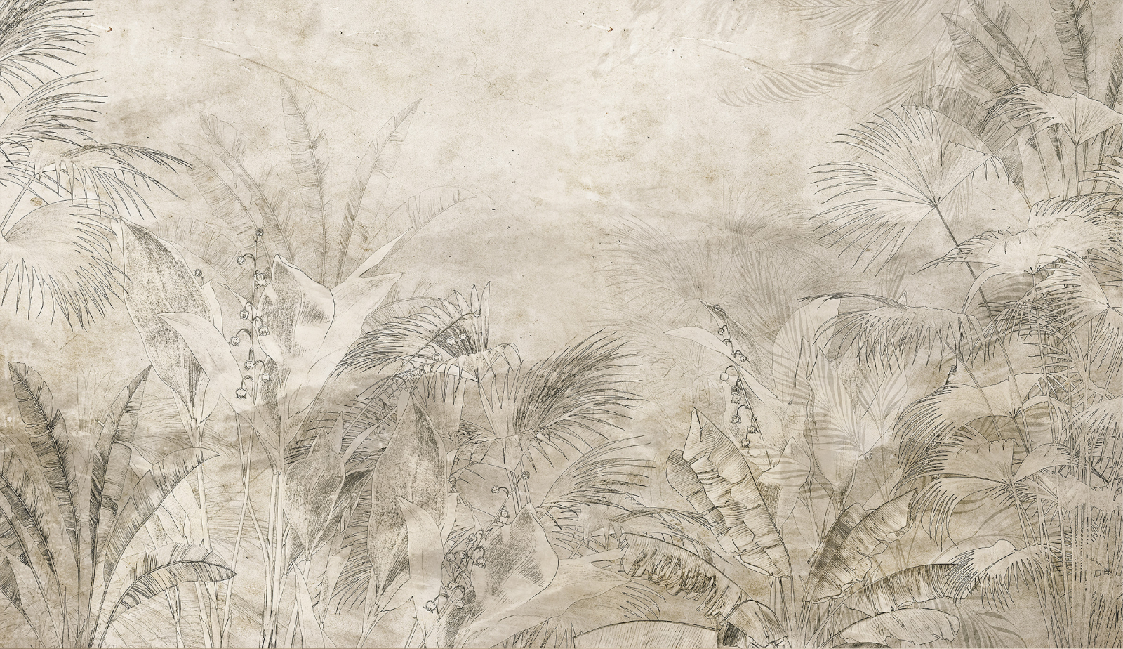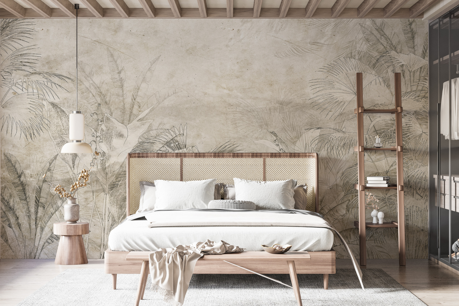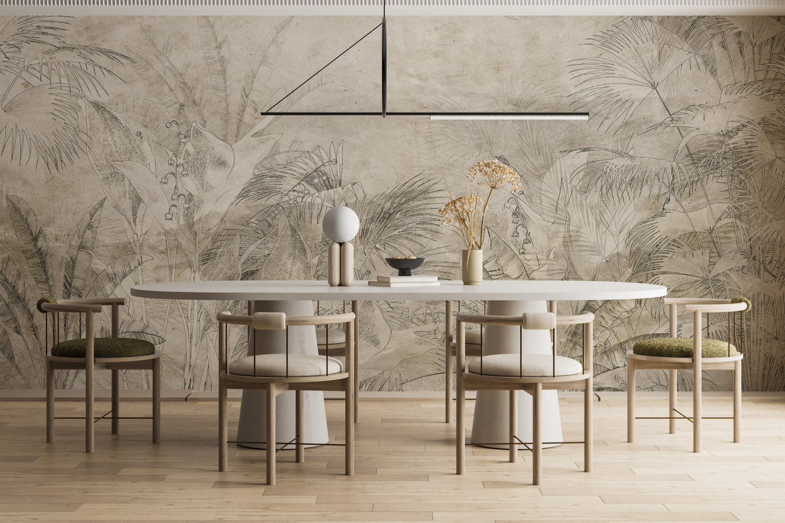Vegetația tropicală îmbrățișează camera în nuanțe plăcute de verde, gri și galben. Plantele uriașe creează un ecosistem suprarealist în care natura devine dominantă, oferind viață și energie întregului spațiu.
