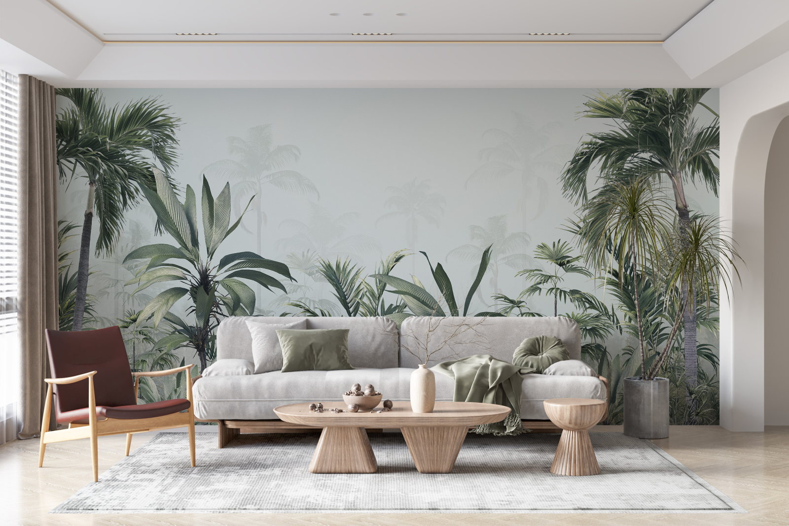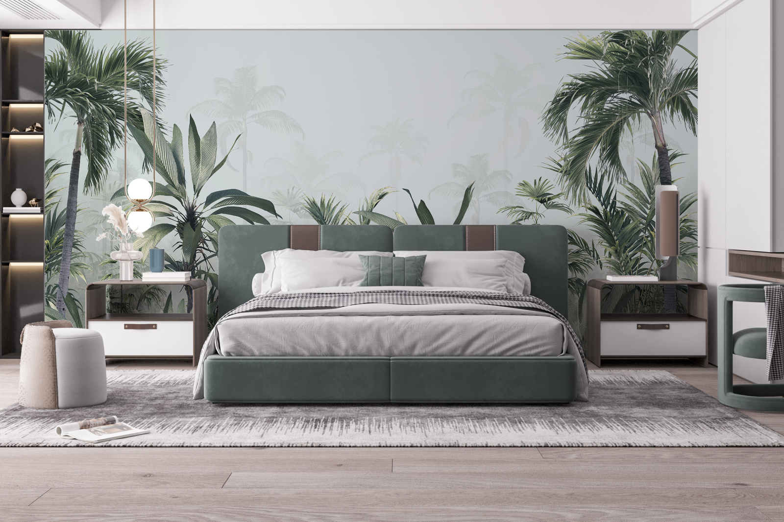 Vegetația tropicală îmbrățișează camera în nuanțe plăcute de verde, gri și galben. Plantele uriașe creează un ecosistem suprarealist în care natura devine dominantă, oferind viață și energie întregului spațiu.