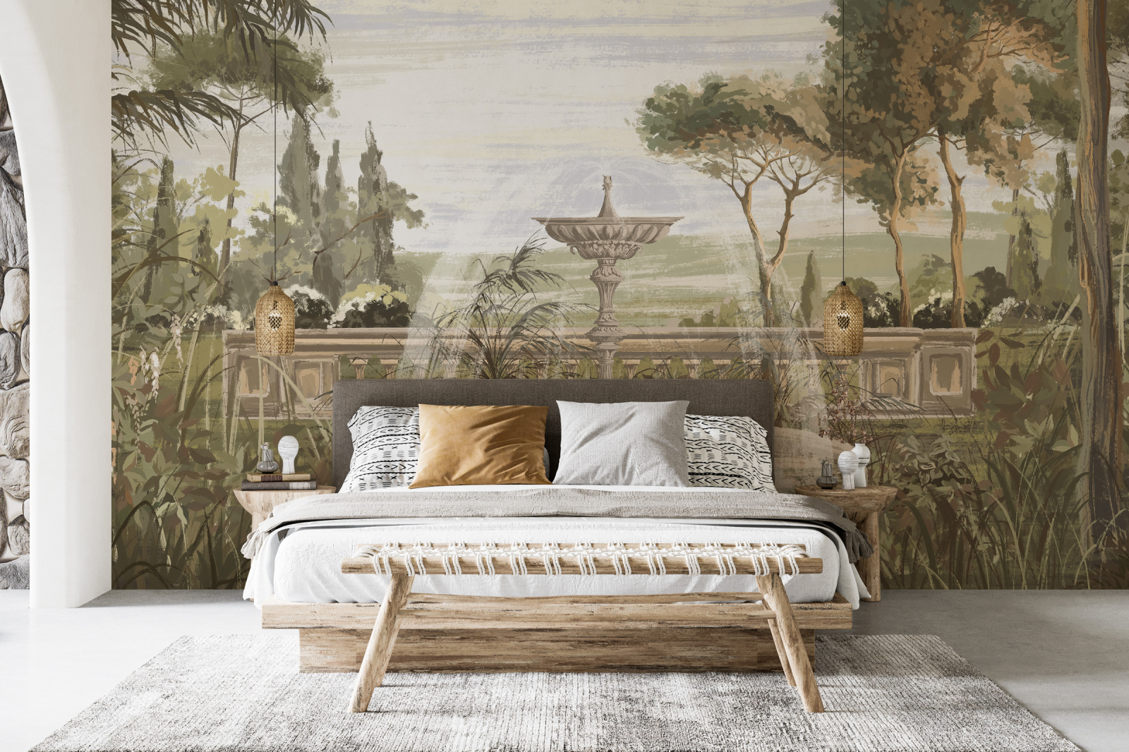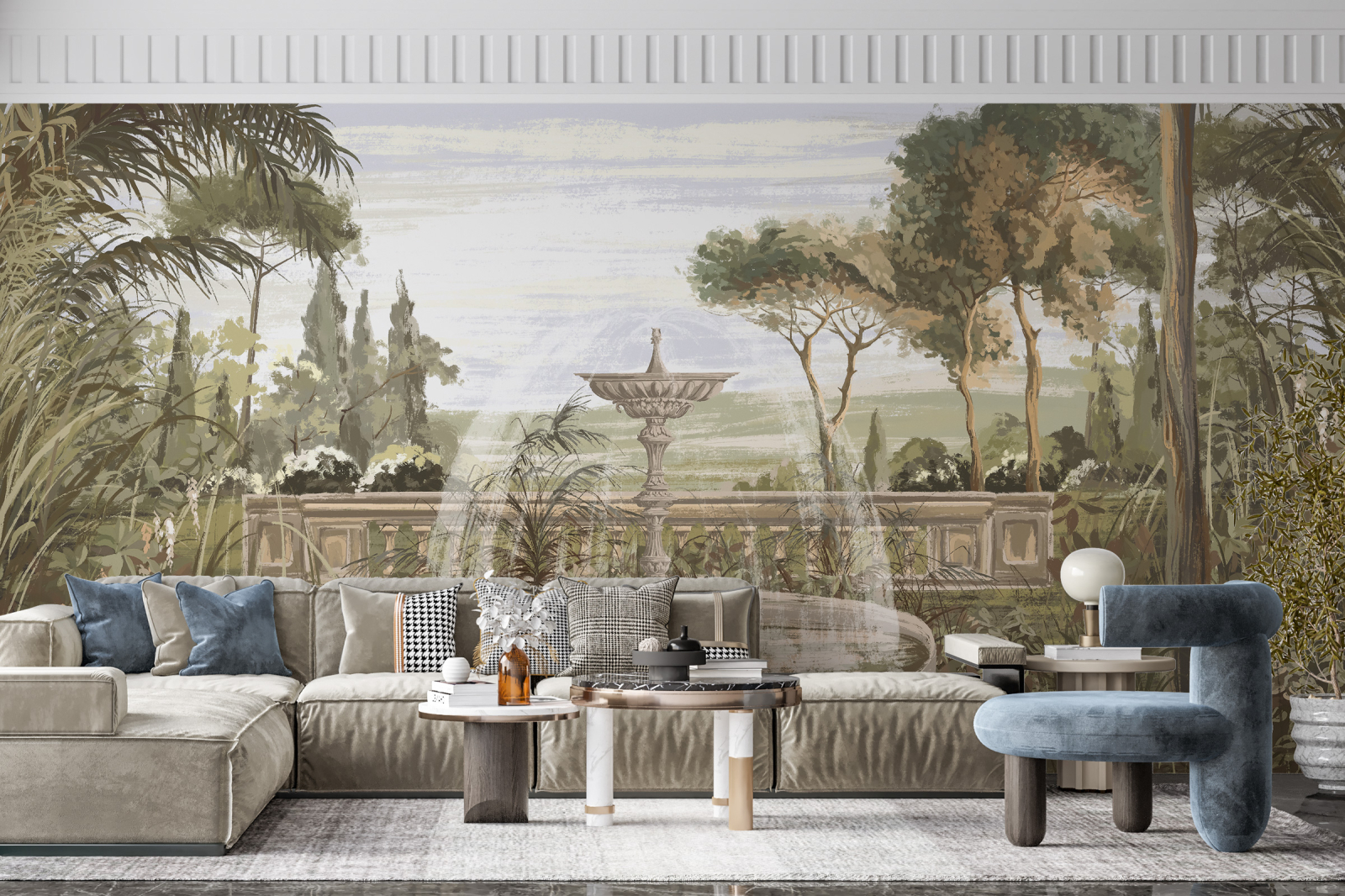 Vegetația tropicală îmbrățișează camera în nuanțe plăcute de verde, gri și galben. Plantele uriașe creează un ecosistem suprarealist în care natura devine dominantă, oferind viață și energie întregului spațiu.